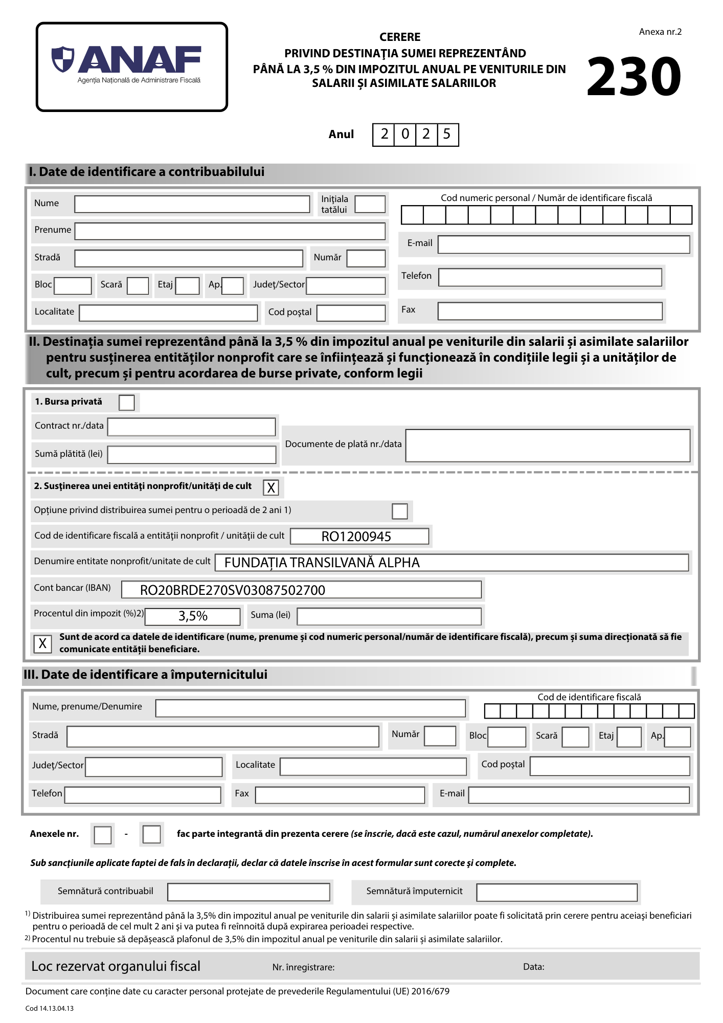 Se va deschide draftul de formular 230, apoi salvează-l, apoi completează-l cu datele tale și trimite-l pe office@alphatransilvana.ro